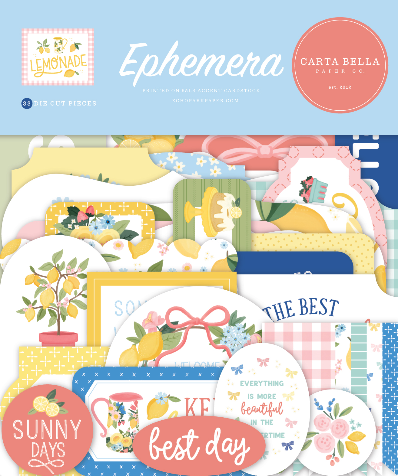 Lemonade - March 2026 - Ephemera Die Cut Cardstock Pack. Pack includes 34 different die cut shapes ready to embellish any project. Package size is 4.5" x 5.25" Ephemera packs are sold in sets of six. Price shown is for six. MADE IN THE USA Suggested Retail Price is $4.99 per piece.