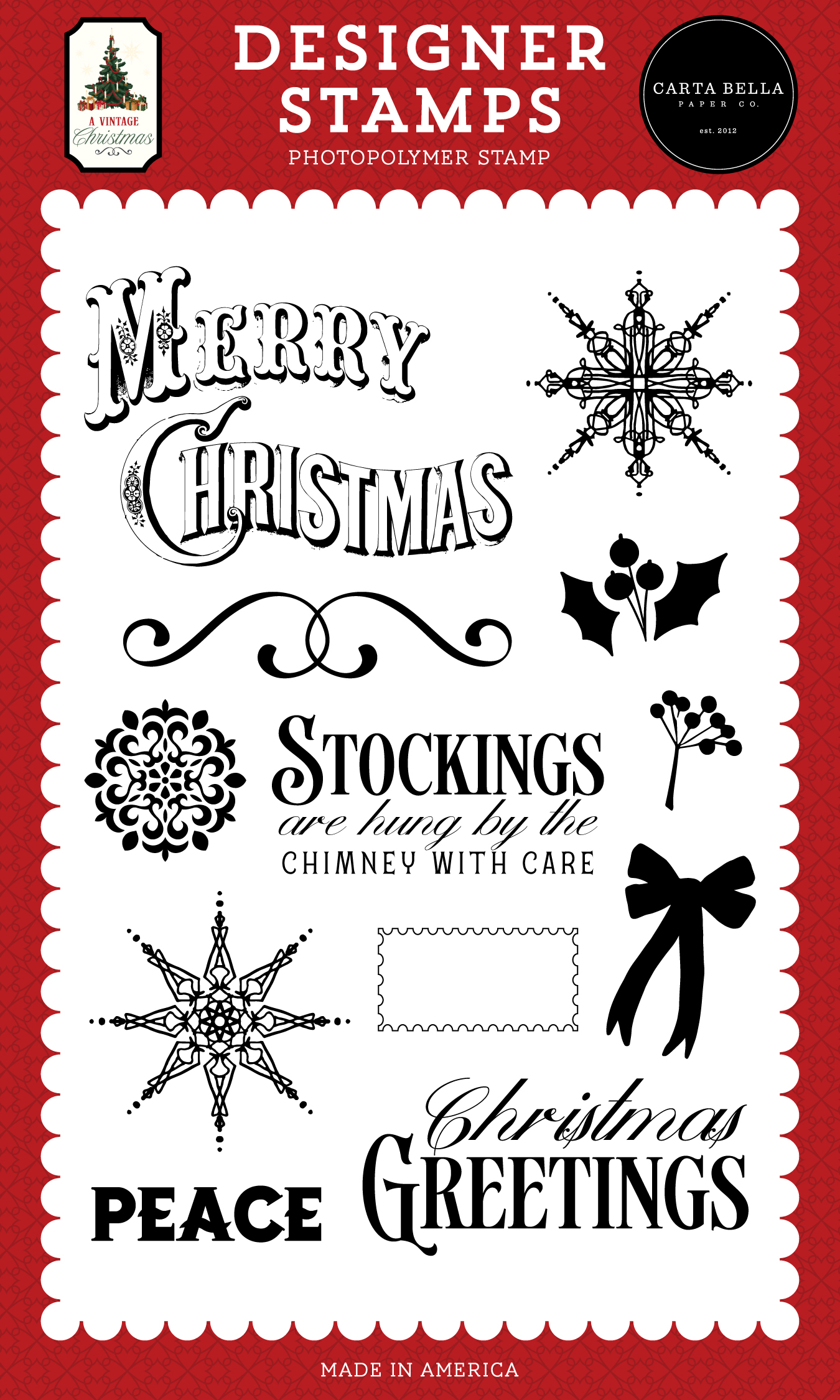 A Vintage Christmas - July 2024 4" x 6" Photopolymer Stamp Set includes 12 Stamps. Sold in sets of 3. Suggested Retail Price is $12.99 per piece. MADE IN THE USA. TO DOWNLOAD HIGH AND LOW RESOLUTION IMAGES, UPC, AND ORDERFORM CLICK HERE