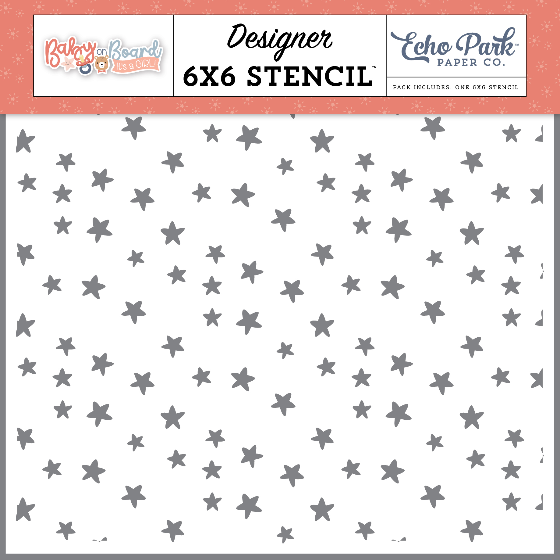 Baby On Board Girl - January 2025 6" x 6" Stencil. To be used with ink, mists, paints or other similar applications. Easy to wipe clean and re-use. Stencils are sold in sets of 6. Price shown is for one set of six stencils. Suggested Retail Price is $6.99 per piece. MADE IN THE USA.