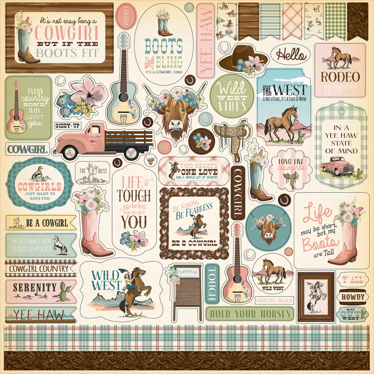 Cowgirl - April 2025 - 12x12 Element Sticker Sheet. Sold in packs of 15. Price shown is for one pack of 15 stickers. Suggested Retail Price is $3.99 per sheet.