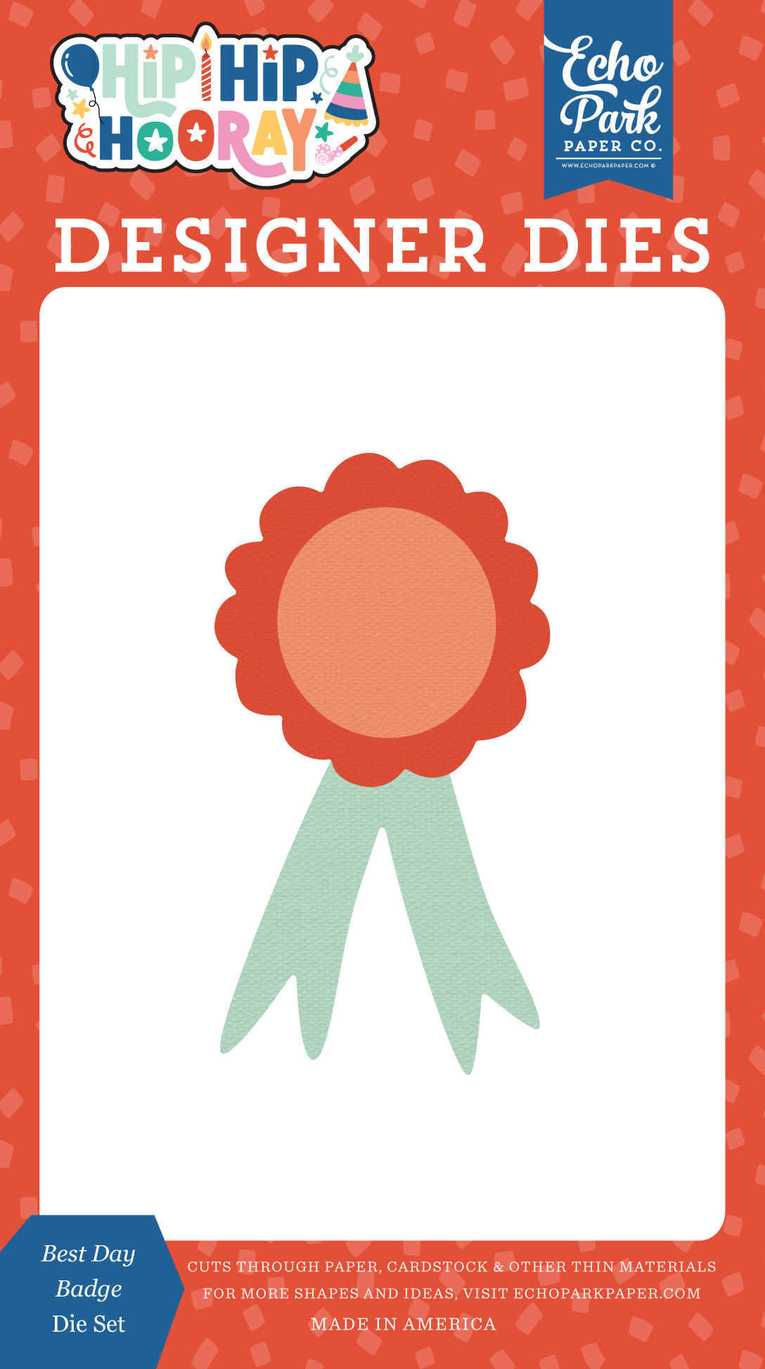 Hip Hip Hooray - December 2024 Small Die Set. Designer Dies from Echo Park cut through paper, cardstock, other thin materials and are compatible with most manual die cut machines. Dies are sold in sets of three. Price shown is for three. Suggested Retail Price is $9.99 per piece. Badge measures 1.6"x3".