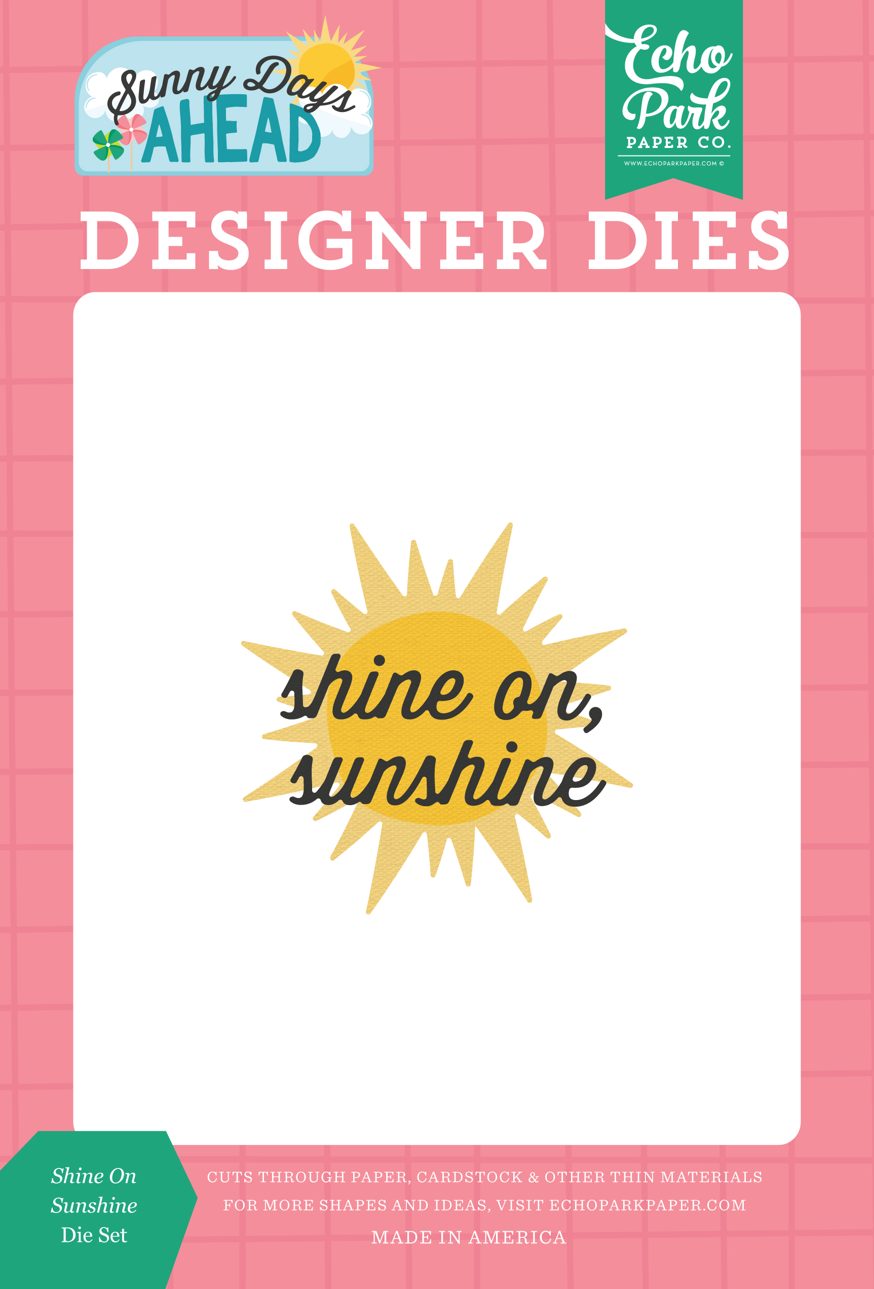 Sunny Days Ahead - June 2024. Large Die Set. Designer Dies from Echo Park cut through paper, cardstock, other thin materials and are compatible with most manual die cut machines. Dies are sold in sets of three. Price shown is for three. Suggested Retail Price is $19.99 per piece. Sun measures 2.5"x2.5". Shine on, measures 2.1"x.5". Sunshine word measures 2"x.4". TO DOWNLOAD HIGH AND LOW RESOLUTION IMAGES, UPC, AND ORDERFORM CLICK HERE