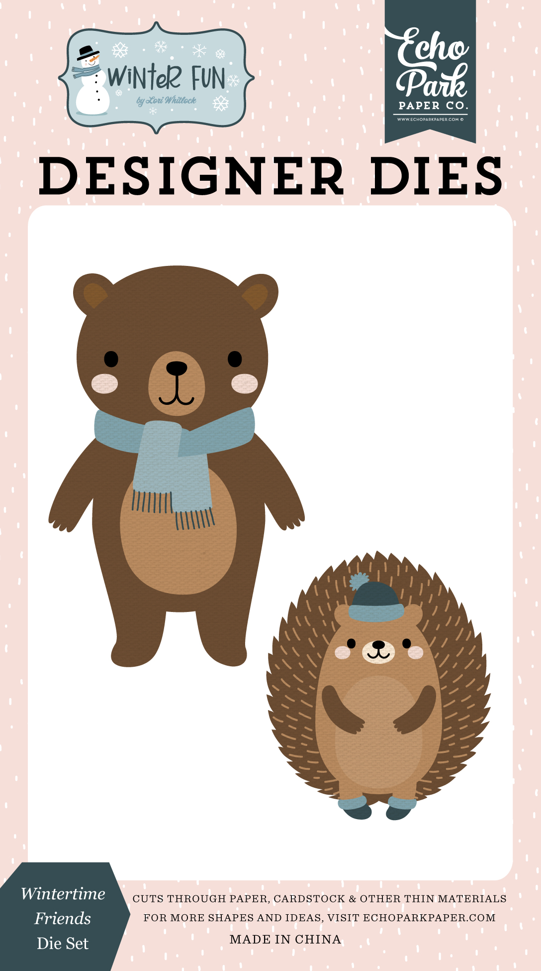 Winter Fun - September 2025 - Small Die Set. Designer Dies from Echo Park cut through paper, cardstock, other thin materials and are compatible with most manual die cut machines. Dies are sold in sets of three. Price shown is for three. Suggested Retail Price is $9.99 per piece. Bear measures 1.7"x2.6". Hedgehog measures 1.5"x1.8".