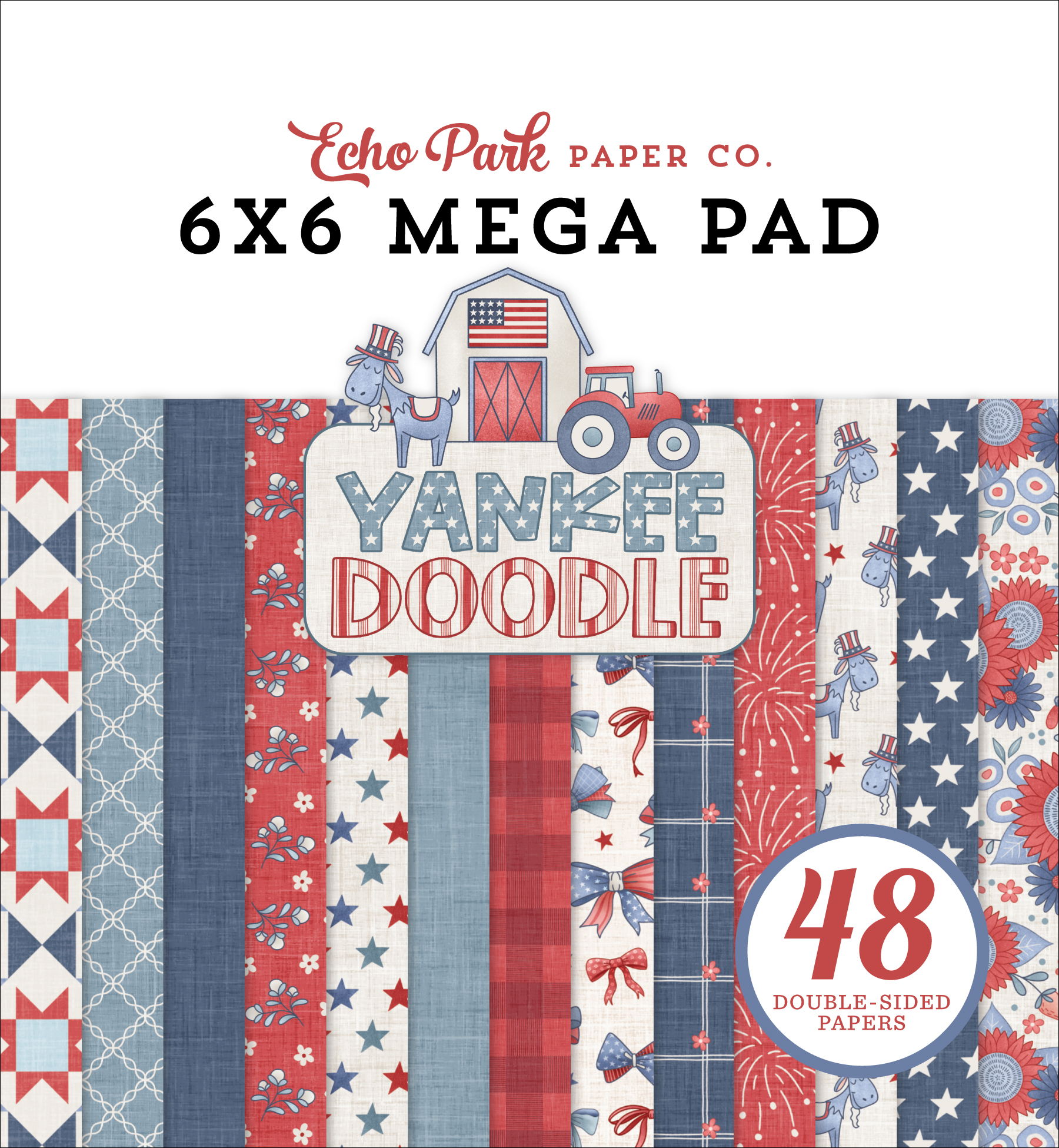 Yankee Doodle - April 2025 48 sheet card making Mega Pads come with all 24 patterns from the collection, solids sheets and exclusive titles included! 6x6 Mega Pads are sold in sets of 6. Price shown is for one set of 6. Suggested Retail Price is $12.99 per pad.