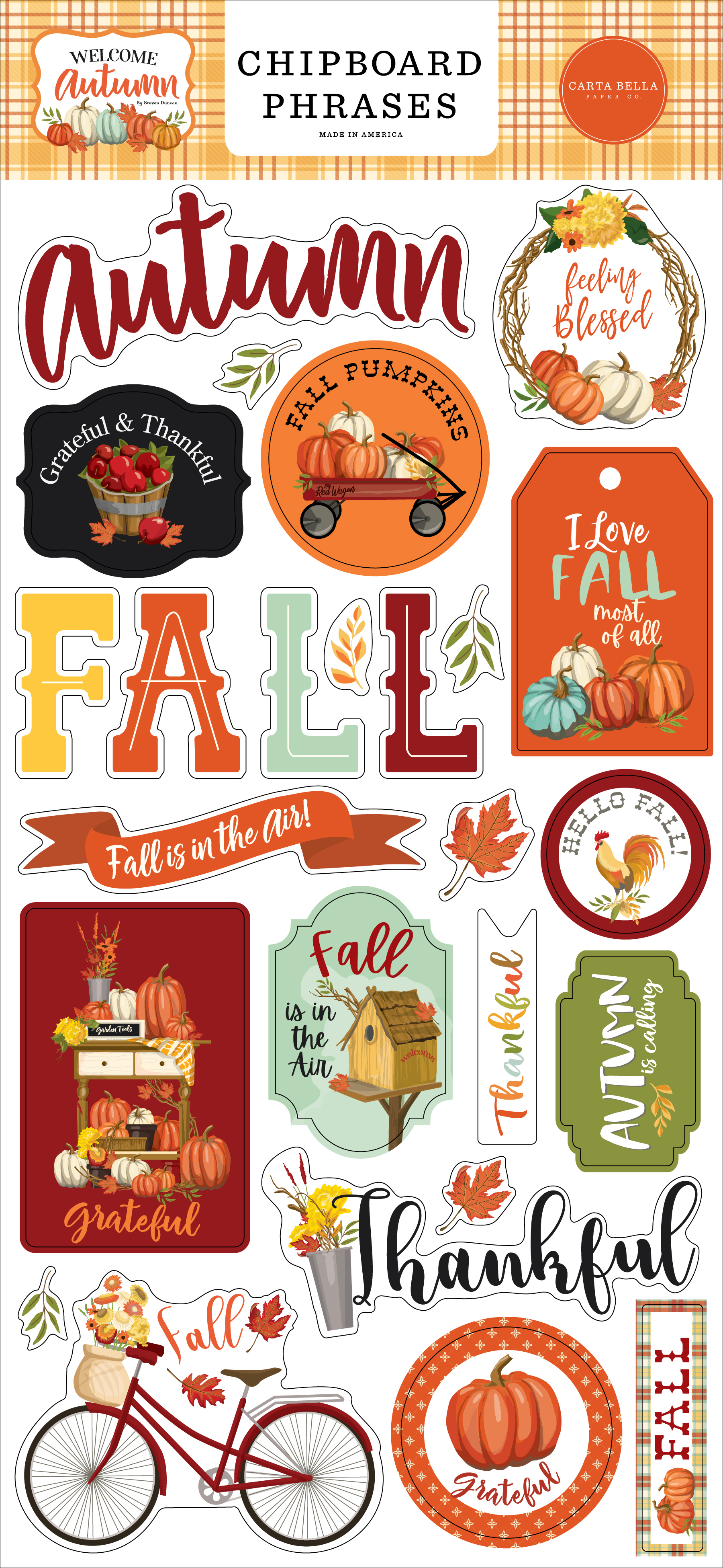 Welcome Autumn - 6x13 Chipboard Accents. Chipboard Accents are sold in sets of 6. Price shown is for one set of 6 chipboard sheets. Suggested Retail Price is $4.99 per piece.
