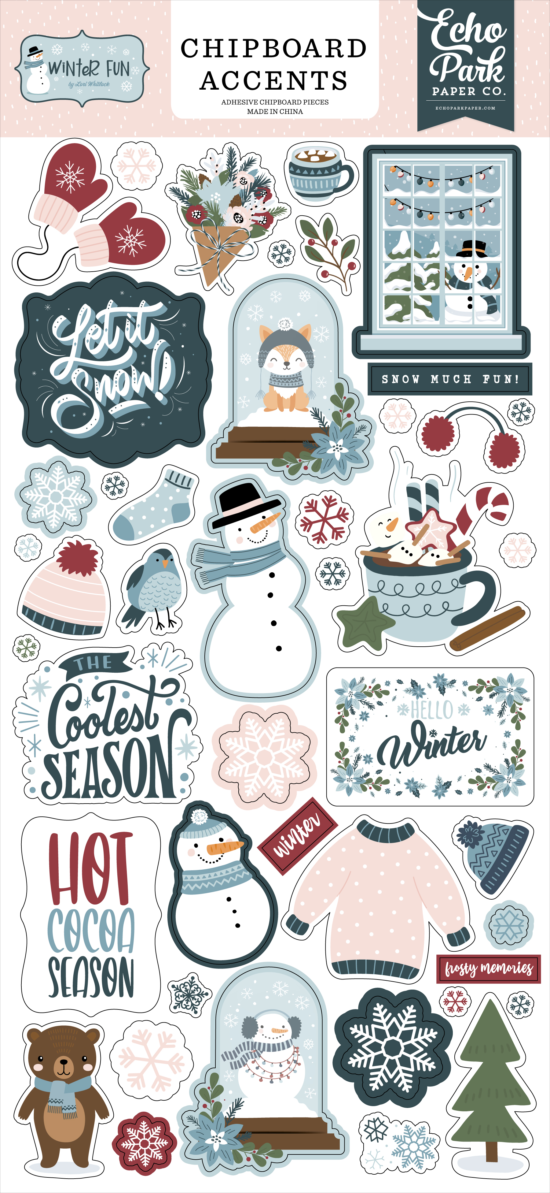 Winter Fun - September 2025 6x13 Chipboard Accents. Chipboard Accents are sold in sets of 6. Price shown is for one set of 6 chipboard sheets. Suggested Retail Price is $4.99 per piece.